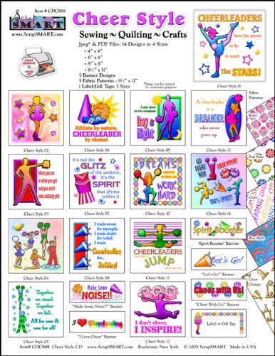 "Cheerleaders are simply a JUMP above the rest," "I don't Cheer I INSPIRE!," and "Athlete by Nature, CHEERLEADER by choice!" can emblazon your next project! Don't waste valuable time dashing around to find designs for cheerleading projects, just print them yourself 24/7. The Cheer Style collection contains inspiring quotes with original drawings by our artists so you can create sparkling projects with "100% Spirit and Cheer Power!--- --- With just the click of a mouse, add Cheerleading motifs to treasured scrapbook pages, rubberstamping, paper crafts, artist trading cards, gift tags, cards, and to lovingly handcrafted quilts. Use for frames, stationery, décor, decoupage, signs, totes, fashions, etc. Create dazzling and inspirational posters, newsletters, and use them for handcrafted projects to sell. Put the designs on invitations, name badges, and gift tags for events and fund-raisers. And yes, use them on your website! See our Angel Policy for details.--- --- There is NO software to install! The collection contains high-resolution Jpeg & PDF files. Jpegs are resizable to customize projects. All designs print on any 8 ½" x 11" paper or fabric sheets. Resize designs with the FREE Picasa program from ScrapSMART's website. For ages 7 & up. There are 175+ vintage or original illustration collections available and they would make wonderful additions to your creative library.- 14 Cheer Designs in four ready-to-print sizes: - 4" x 4", 6" x 6", 8" x 8" and 8 ½" x 11"- 5 Overall Pattern Designs - 8 ½" x 11"- 1 Label, Frame, or Gift Tag Design in three sizes- 5 Banner Designs in three sizes- Handy package shows each design--- --- Easy to Use in PC & MAC - For personal use only. Contact us for commercial use.- Windows® 98/2000/NT®/Me/XP/Vista/Windows7- Macintosh® 8.x-9.x or OS X- Microsoft Word 97 or higher